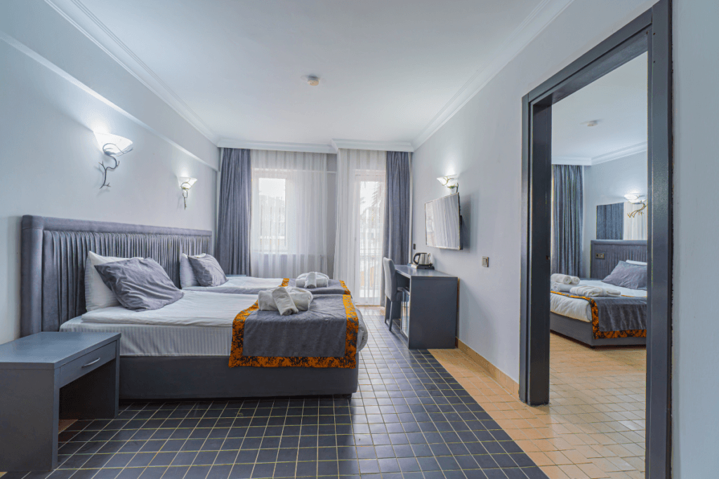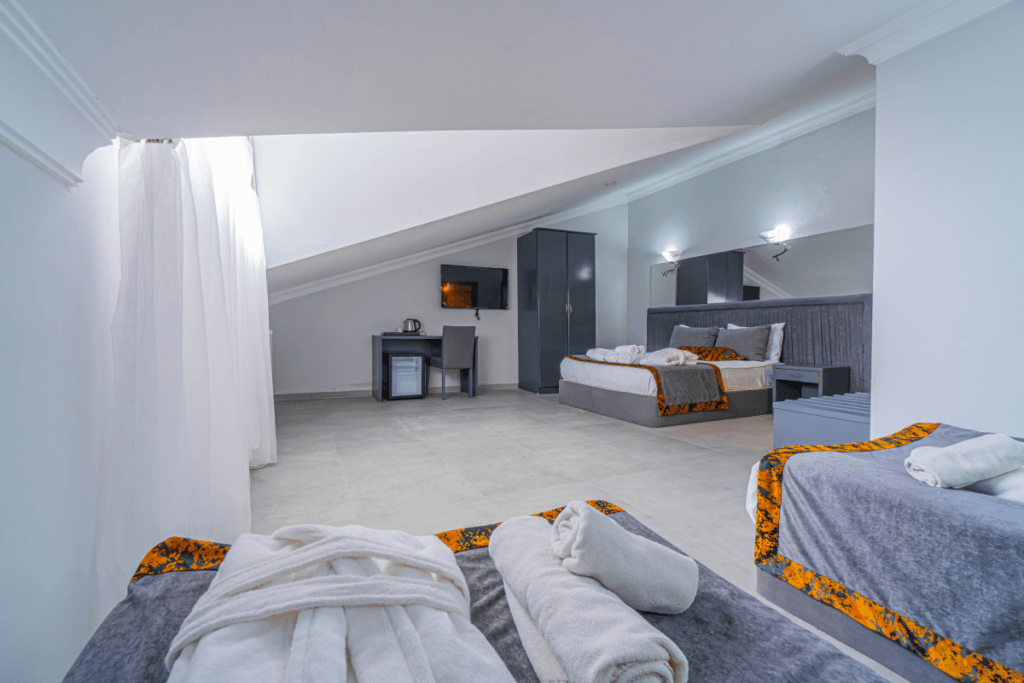 33 m² olan bu oda tipi geniş ve konforlu yapısıyla ailelerin konaklaması için idealdir. Oda, 1 adet çift kişilik yatak ve 2 adet tek kişilik yatak ile toplamda 4 yetişkin için standart konaklama kapasitesine sahiptir. İhtiyaç durumunda 1 ilave yatak ve 1 bebek yatağı eklenerek kapasite artırılabilir.