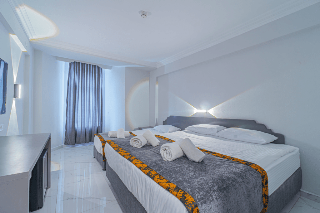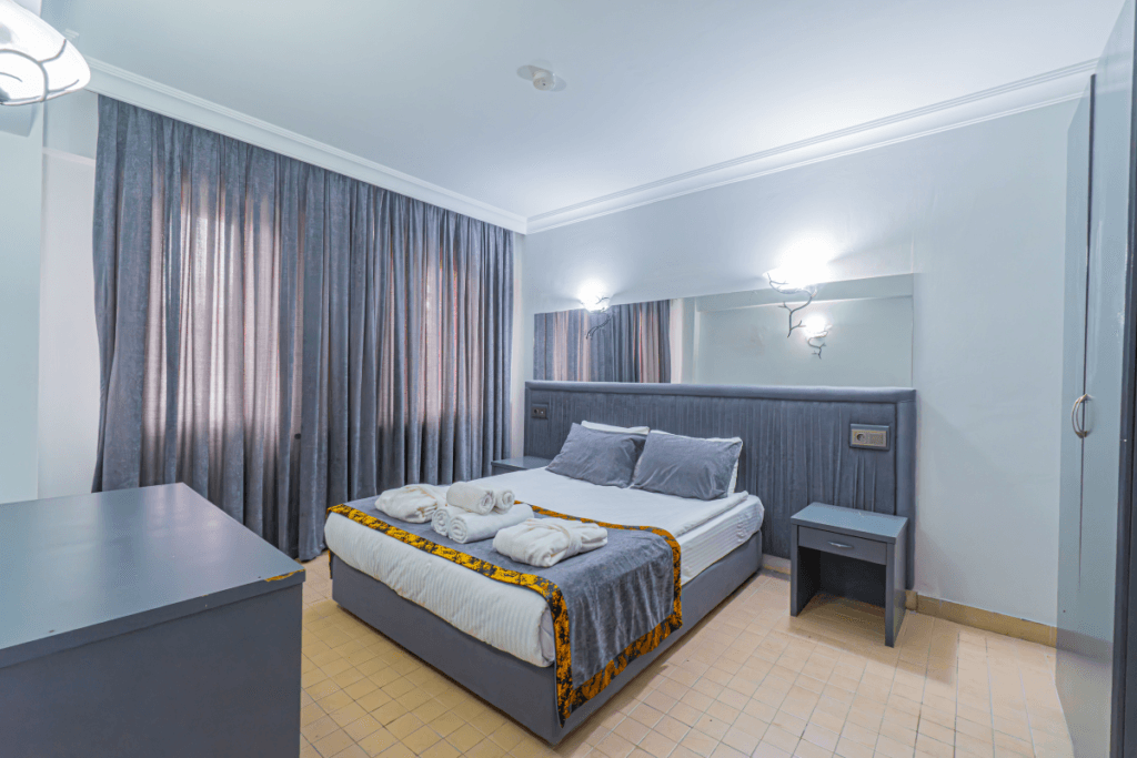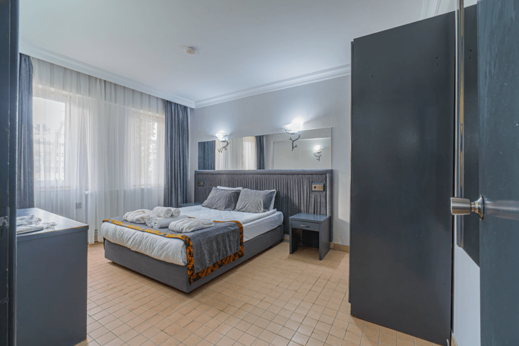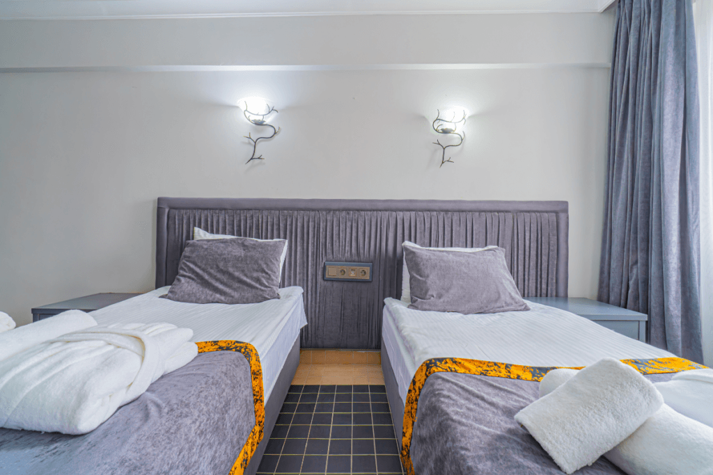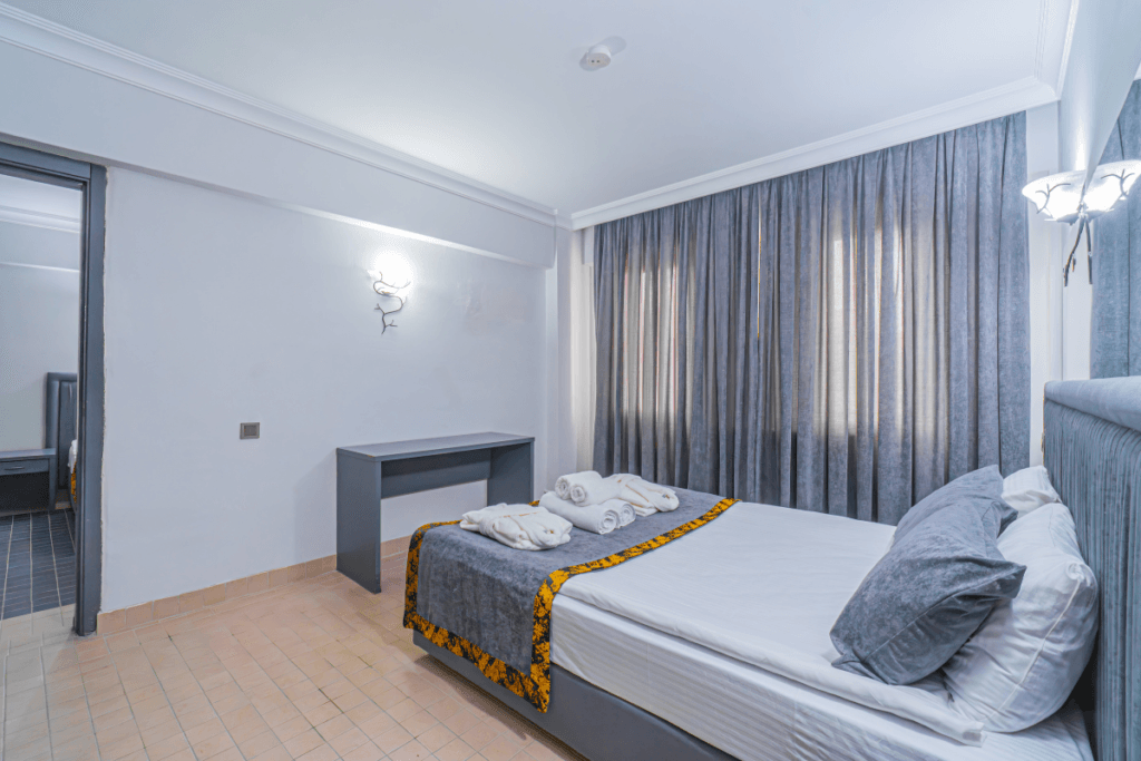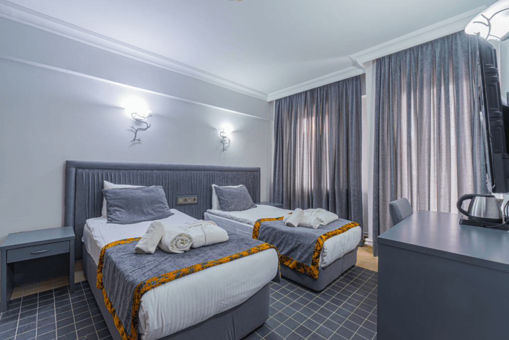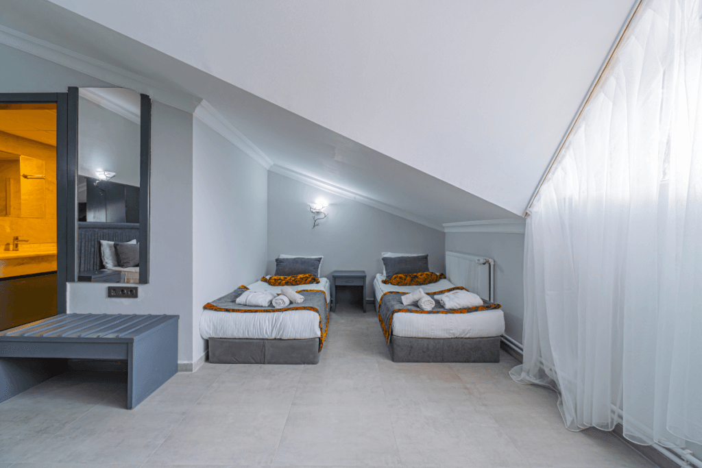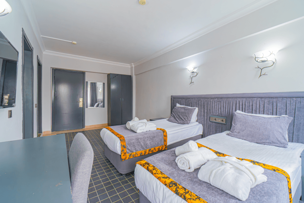 Manzarasız ve dış üniteye sahip olmayan odada penceresi diğer odalara göre daha küçüktür. B Blok’ta bulunan bu oda, şık ve sade tasarımıyla rahat bir konaklama deneyimi sağlar.