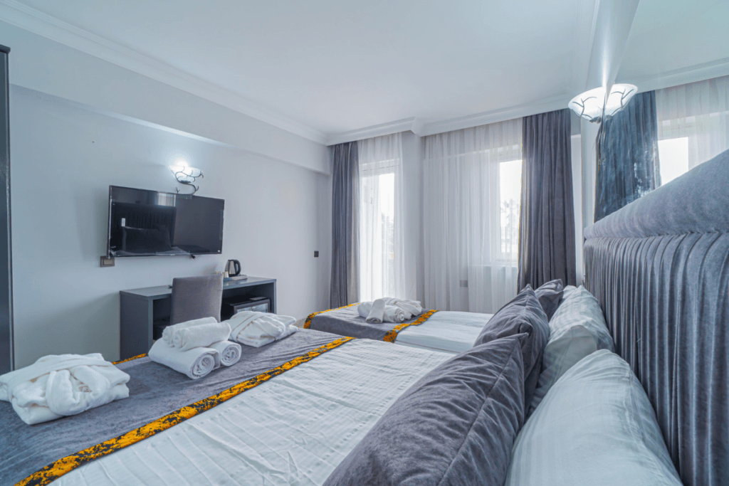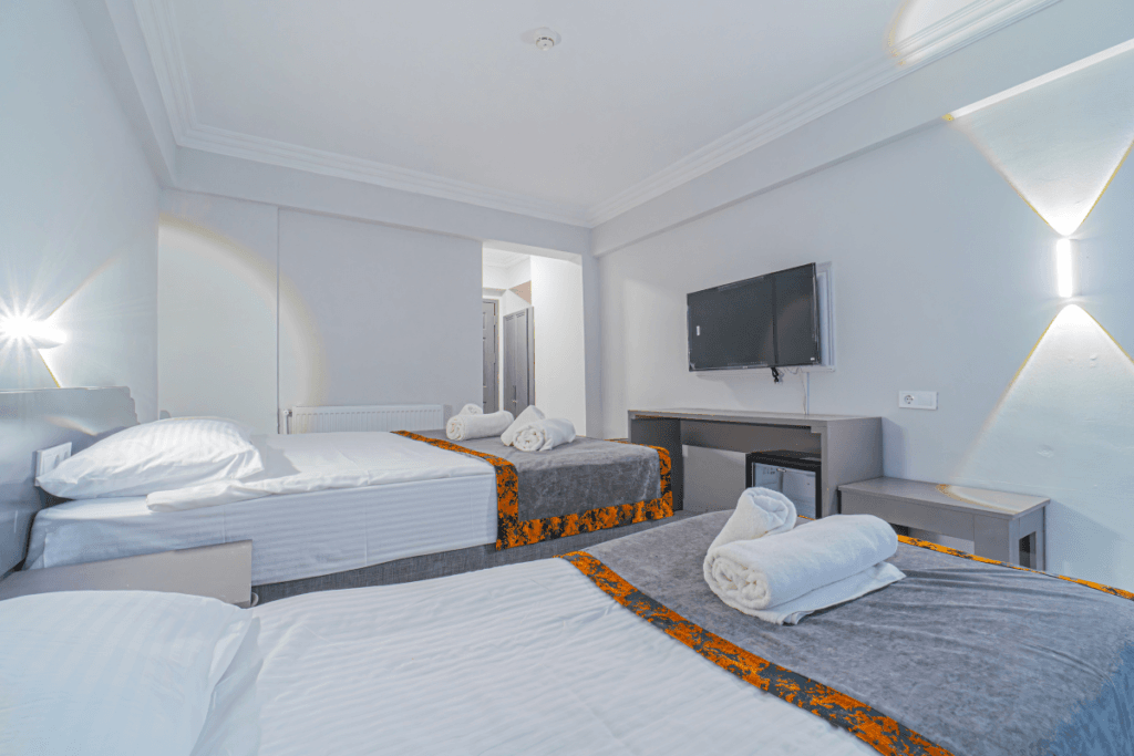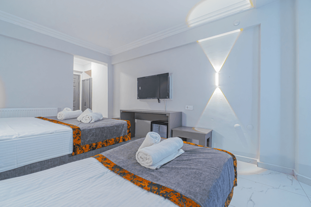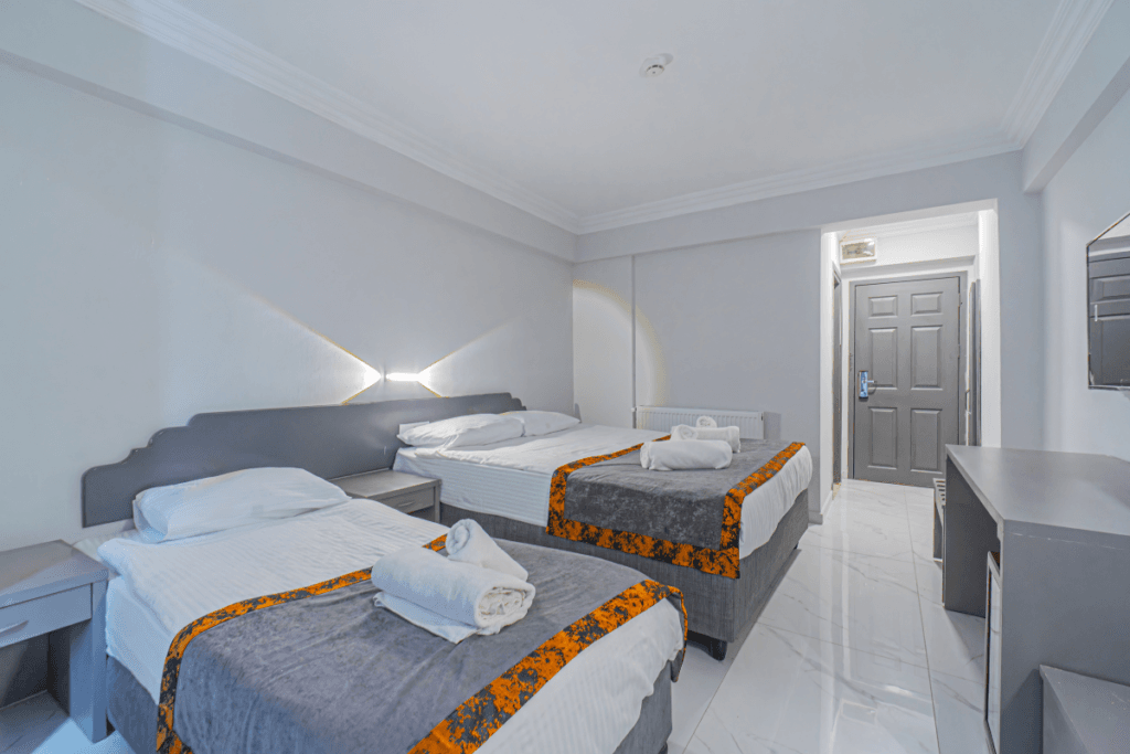 20 m² alana sahip olup, 3 yetişkin veya 3 yetişkin + 1 bebek yatağı kapasitesiyle konforlu bir konaklama imkanı sunar. Bahçe veya otopark manzaralı balkonuyla keyifli bir ortam sağlayan odalarımızda, 3 yetişkin için ideal bir konaklama alanı bulunur.